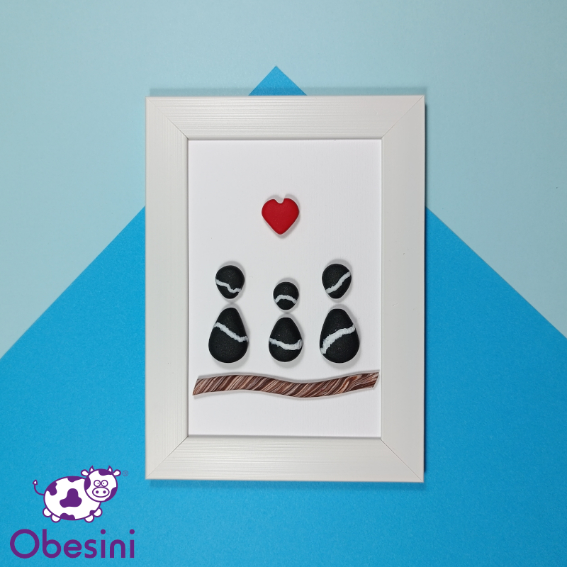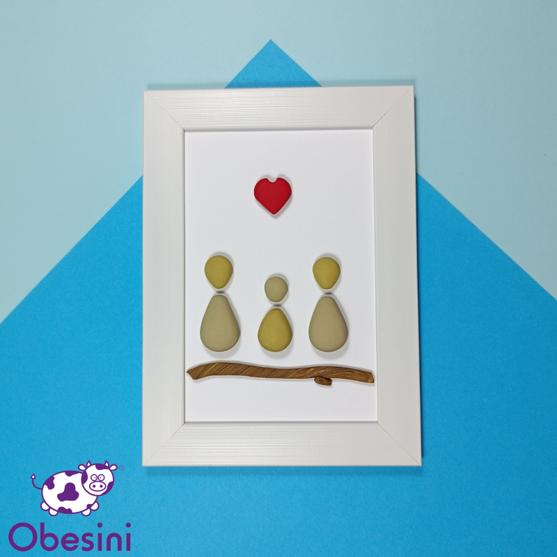 Quadro della linea “Piccoli Sassi” che rappresenta una famiglia composta da tre persone, realizzate in fimo con effetto sasso, più cuore e decorazione effetto legno.