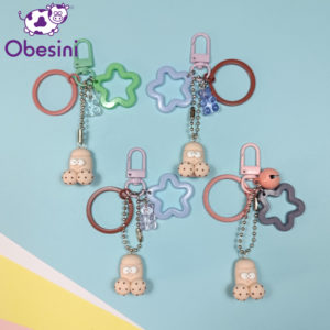 Ciondolo in fimo; ganci, catenelle, campanellini, anellini e anelli portachiavi in metallo; stelline e orsetti in resina.