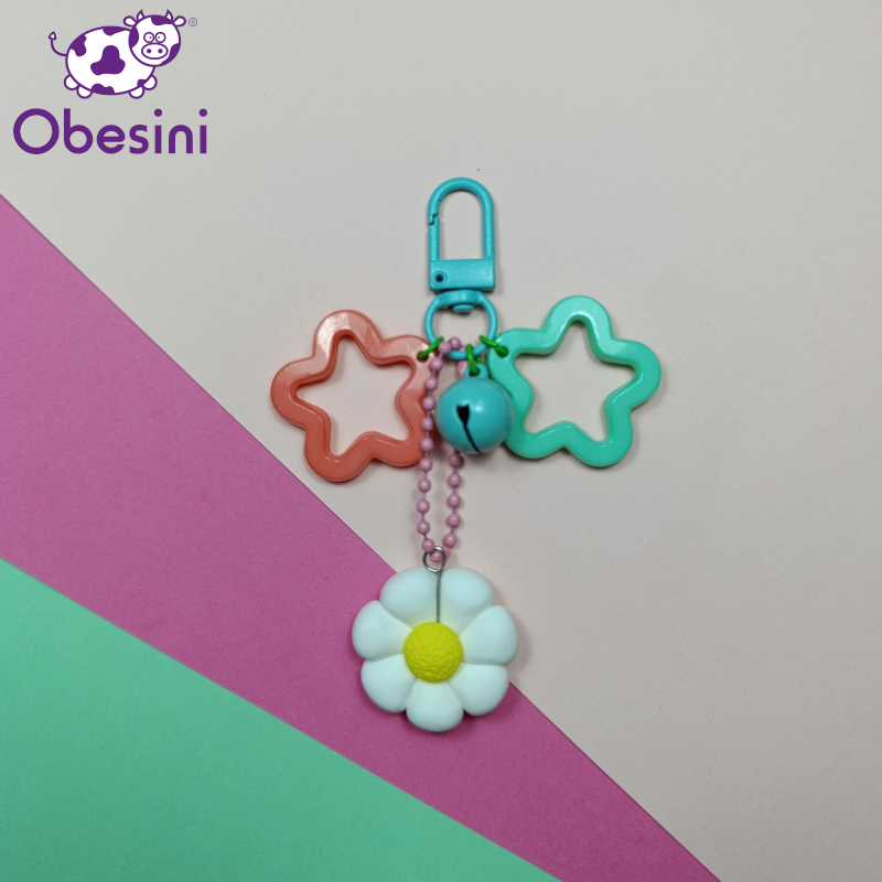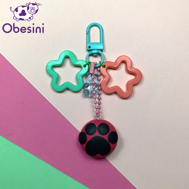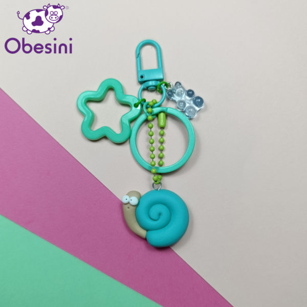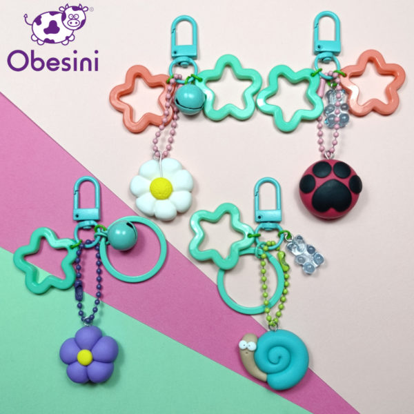 Ciondolo in fimo; ganci, catenelle, campanellini, anellini e anelli portachiavi in metallo; stelline e orsetti in resina.